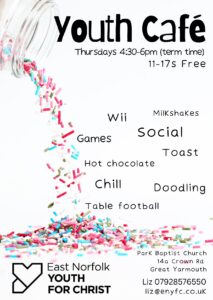 In Belton, we meet on Friday afternoons, and in Great Yarmouth, we meet on Thursday afternoons, both during term time. Each session is free for young people of high school age and includes hot chocolate and toast, pool, table tennis, Wii, crafts, board games and puzzles.